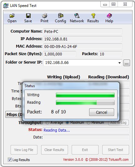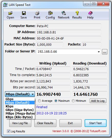 LAN Speed Test was designed from the ground up to be a simple but powerful tool for measuring file transfer, hard drive, USB Drive, and Local Area Network (LAN) speeds (wired & wireless). It does this by building a file in memory, then transfers it both ways (without effects of windows file caching) while keeping track of the time, and then does the calculations for you. Simple concept and easy to use. You'll find that LAN Speed Test will quickly become one of your favorite network tools!